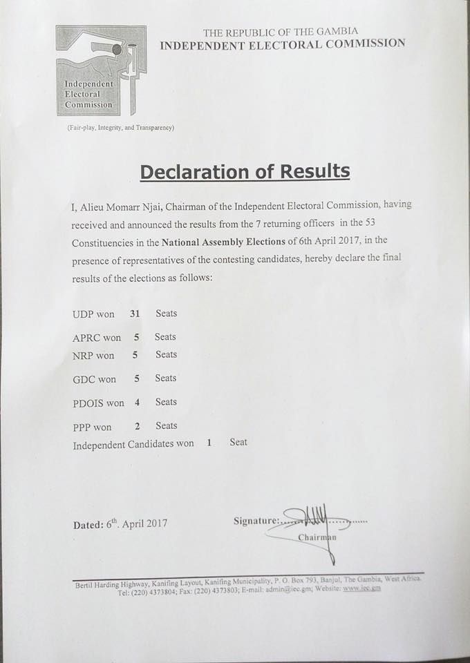 1.Muhammed Ndow- Banjul Central-PPP 2.Fatoumatta Njie-Banjul South-PPP 3.Ousman Sillah-Banjul North-PDOIS 4.kajali Fofana-Jarra West-UDP 5.Kebba Jallow-Jarra Central-GDC 6.Sainey Touray-Jarra East-UDP 7.Yaya Gassama-Kiang East-UDP 8.BaKary Camara-Kiang Central-UDP 9.Fakebba NL Colley-kiang West-UDP 10.Assan Touray-Bakau-UDP 11.Alhagie Drammeh-Jeshwang-UDP 12.Halifa Sallah-Serrekunda-PDOIS 13.Madi MK Ceesay-Serrekunda West-UDP 14.Fatou K Jawara-Tallinding-UDP 15.Bakary Njie-Bundung-UDP 16.Saikou Marong-Latrikunda-UDP 17.Matarr Jeng- Lower Niumi-UDP 18.Omar Darboe-Upper Niumi-UDP 19.Salifu Jawo-Jokadu-GDC 20.Alhagie Jawara-Lower Baddibu-UDP 21.Sulayman Saho-Central Baddibu-UDP 22.Dembo KM Camara-Illiasa-UDP 23.Ousman Touray-Sabach sanjal-NRP 24.Momodou Ceesay-Janjanbureh-UDP 25.Demba Sowe-Niamina West-GDC 26.Omar Ceesay-Niamina East-GDC 27.Samba Jallow-Niamina Dankunku-NRP 28.Alhagie Darboe-Lower Fulladu West-UDP 29.Dawda Kawsu Jawara-Upper Fulladu West-UDP 30.Sainey Jawara-Lower Saloum-NRP 31.Alhagie Mbow- Upper Saloum-NRP 32.Alhagie FB Sillah-Niani-UDP 33.Amadou Camara-Nianija-NRP 34.Alfusani Y Ceesay-Sami -UDP 35.Suwaidou Touray-Willi East-PDOIS 36.Sidia S Jatta- Wulli West-PDOIS 37.Billay G Tunkara-kantora-UDP 38.Foday NM Drammeh-Tumana -UDP 39.Muhammed Magassy-Basse-Independent 40. Alhagie H Sowe-Jimara-GDC 41.Kaddy Camara- Foni Bondali-APRC 42.Musa Amui Nyassi-Foni Kansala-APRC 43.Momodou Camara-Foni-Bintang-APRC 44.Lamin FM Conta-Kombo East-UDP 45.Baba Galleh Jallow-Sanimentereng-UDP 46.Alhagie S Jammeh -Foni Jarrol-APRC 47.Abdoulie Ceesay-Old Yundum-UDP 48.Saikouba Jarju-Busumbala-UDP 49.Kebba K Barrow-Kombo South-UDP 50.Lamin J Sanneh-Brikama South-UDP 51.Alagie S Darboe- Brikama North- UDP 52. Muhammed Mahanera-Sandu -UDP 53. Sunkary Badjie-Foni Brefet-APRC SUMMARY: Indept 1, PPP 2, PDOIS 4, APRC 5, GDC 5, UDP 31, NRP 5. Thanks to u all !!!